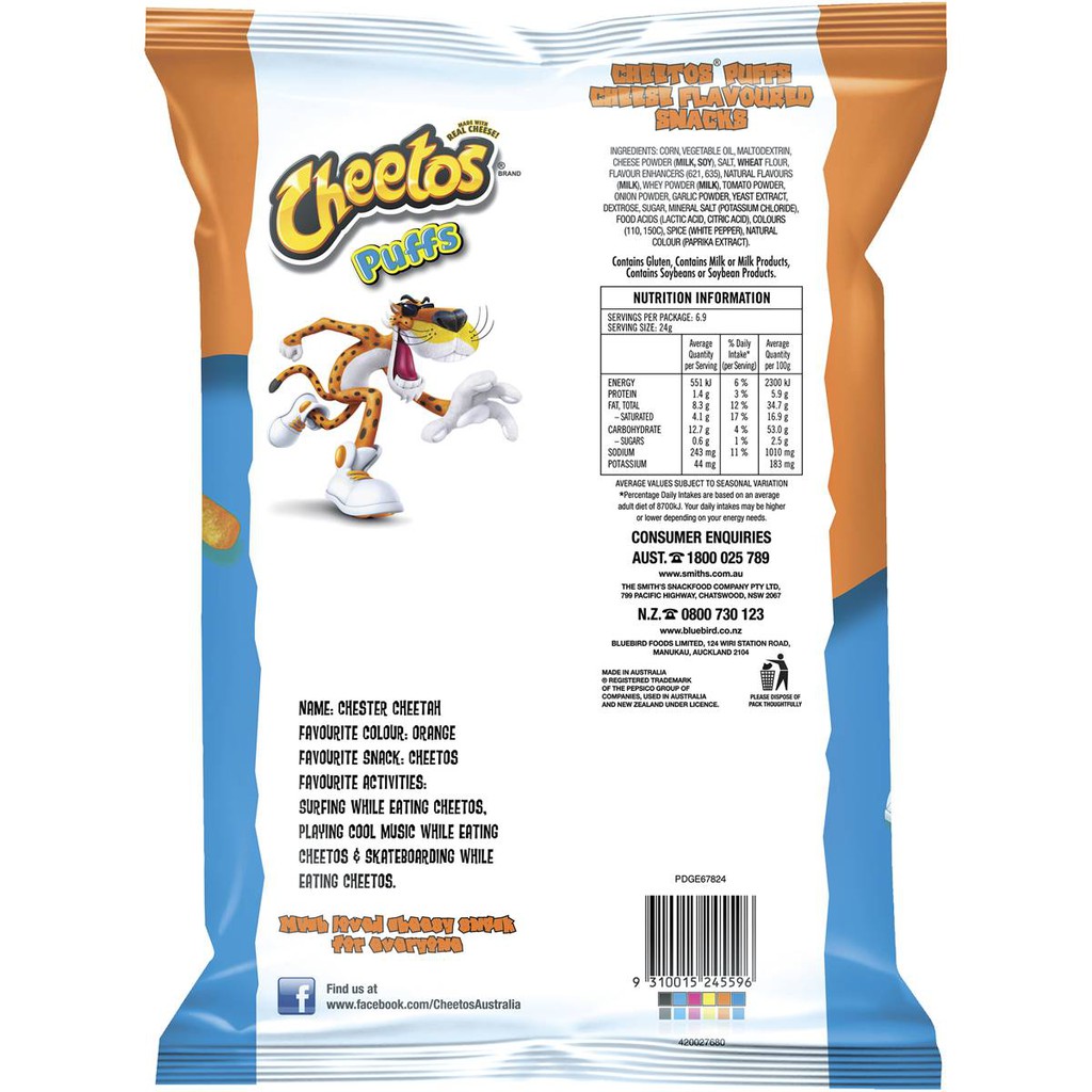 Cheetos Nutrition Facts. Calories, carbs, fat, sodium & more - MyFoodDiary Get nutrition information for Cheetos items and over 200,000 other foods (including over 3,500 brands). Track calories, carbs, fat, sodium, sugar & 14 other nutrients. Oven baked hot cheetos Nutrition Facts & Calories - Inlivo Contain a moderate amount of risky components that may include saturated fat, sodium and sugars (0.02%/oz). Good source of proteins (14% of DV/100g). Good source of fiber (14% of DV/100g). Relatively high in carbs (24% of DV/100g). Calories in 1 Pieces (1 oz) 128 calories / 44 from fat Carbohydrates 20 g Proteins 2 g Fat 4.9 g Saturated Fat 1 g Home | Cheetos CHEETOS® snacks are the much-loved cheesy treats that are fun for everyone! You just can't eat a CHEETOS® snack without licking the signature "cheetle" off your fingertips. And wherever the CHEETOS® brand and CHESTER CHEETAH® go, cheesy smiles are sure to follow. Hot Cheetos Nutrition Label - This Nutrition Published on: 19/01/2021 | Last Updated: 06/04/2021. Learn more information about hot cheetos nutrition label. In this article we'll discuss hot cheetos nutrition label.