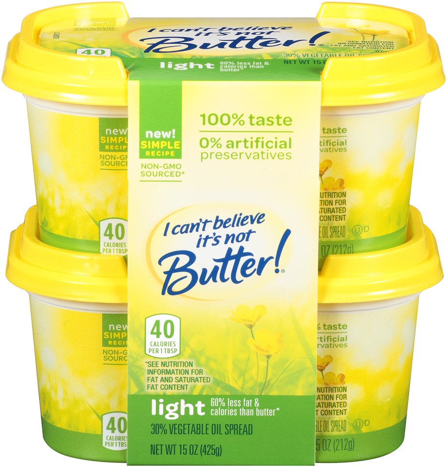 I Can't Believe It's Not Butter! Light Spread - H-E-B I Canu001at Believe Itu001as Not Butter! Light has amazing fresh butter taste with 80% less saturated fat and 60% fewer calories than butter. This deliciously simple spread contains no artificial flavors, no artificial preservatives and 0 grams trans-fat. Preparation instructions Keep refrigerated. For best quality do not freeze.