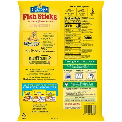 Child Nutrition Information - Gorton's Seafood Child Nutrition Information. January 03, 2022. Product Name: Gorton's Super Crunchy Fish Sticks Product Codes: 44400 104900 Size: 64 ct - 60.8 oz (3.8 lbs) Distributed by: Gorton's, Gloucester, MA 01930 List Varieties of Fish Used in Product: Alaska Pollock Total Weight per Stick of Uncooked Product (as purchased): 0.95 oz per stick Weight of Raw Fish per Portion: 0.47 oz raw fish per stick USDA/USDC Authorized Labels and Manufacturers It is the manufacturer's responsibility to ensure that the product label meets all over federal labeling requirements. CN Label Verification Report (8/10/2022) CN Label Manufacturers Report (4/13/2022) USDA's Agricultural Marketing Service (AMS) has published a list of manufacturers that have met the Food and Nutrition Service's quality ...