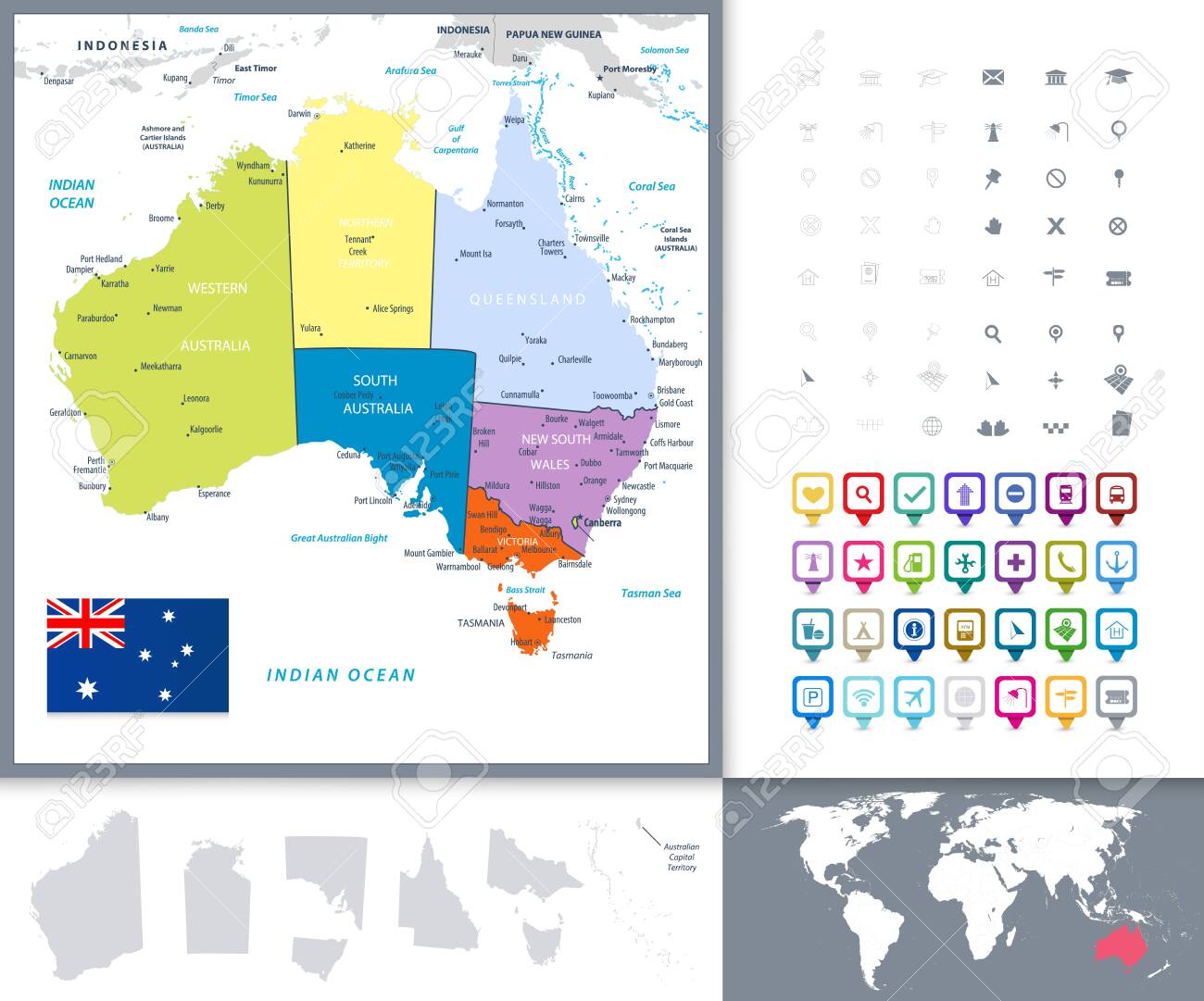 Map of Australian Landmarks Interactive Map of Australia with all our Australian Landmarks pin pointed. Australia Geography - Enchanted Learning Australia, nicknamed the "Land Down Under,", is a country, an island and a continent. It is the world's smallest continent and the sixth-largest country. It is located in the Southern Hemisphere, between the Indian Ocean and the Southern Pacific Ocean.. Template:Australia Labelled Map - Wikipedia Western Australia in the west third with capital Perth, Northern Territory in the north center with capital Darwin, Queensland in the northeast with capital Brisbane, South Australia in the south with capital Adelaide, New South Wales in the northern southeast with capital Sydney, and Victoria in the far southeast with capital Melbourne.