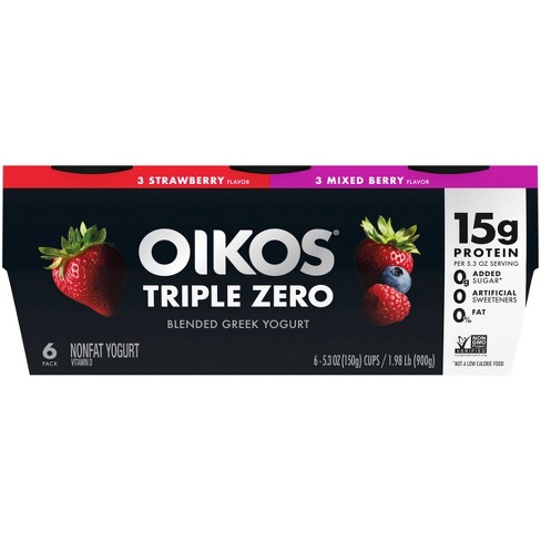 Dannon Oikos Triple Zero Strawberry Greek Yogurt - H-E-B Oikos Triple Zero Greek Nonfat Yogurt gives you all the flavor you seek in a Greek yogurt--but with 0 added sugar*, 0 artificial sweeteners, and 0 fat, with 15 grams of protein per 5.3 oz cup. Full of delicious strawberry flavor, this Greek nonfat yogurt makes a delicious snack any time of day.