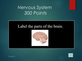 Brain quizzes - PurposeGames All Quizzes > Brain. brain anatomy EC by mkellner24 436,316 plays 10p Image Quiz. Basic Brain Anatomy by chwchang 304,592 plays 14p Image Quiz. Brain Structure Identification by KeeneyQuest 153,681 plays 13p Image Quiz. Label Parts of the Brain by ninalahoti 129,212 plays 12p Image Quiz. Brain Labeling (Nervous System) EC by tcullen 124,761 ...