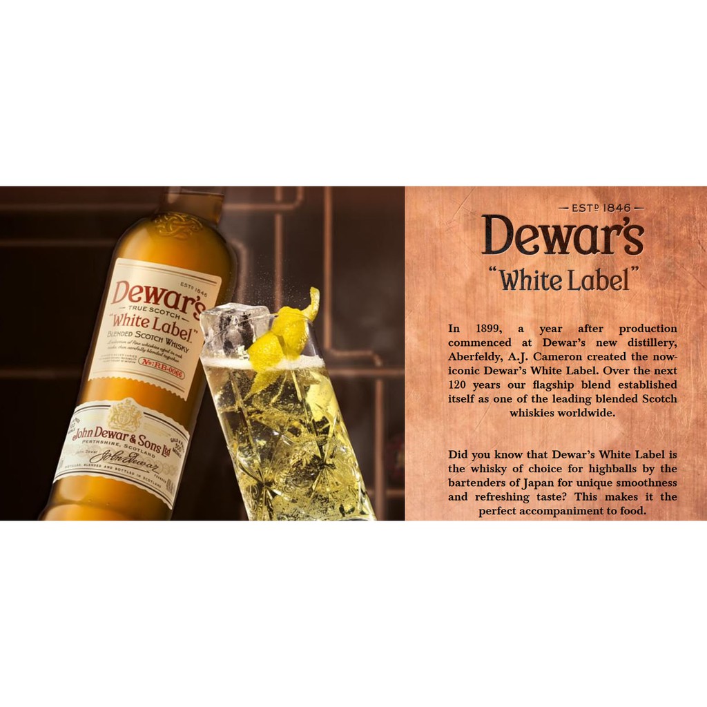 Dewar's White Label, 750 mL, 80 Proof - amazon.com The iconic Dewar's White Label is a timeless Scotch whisky that tastes as full and round today as it did over a century ago when it was created by our first Master Blender, A.J. Cameron. Dewar's White Label contains around 40 of Scotland's finest single malts, with Aberfeldy at its heart. It is rich, golden and mellow throughout.