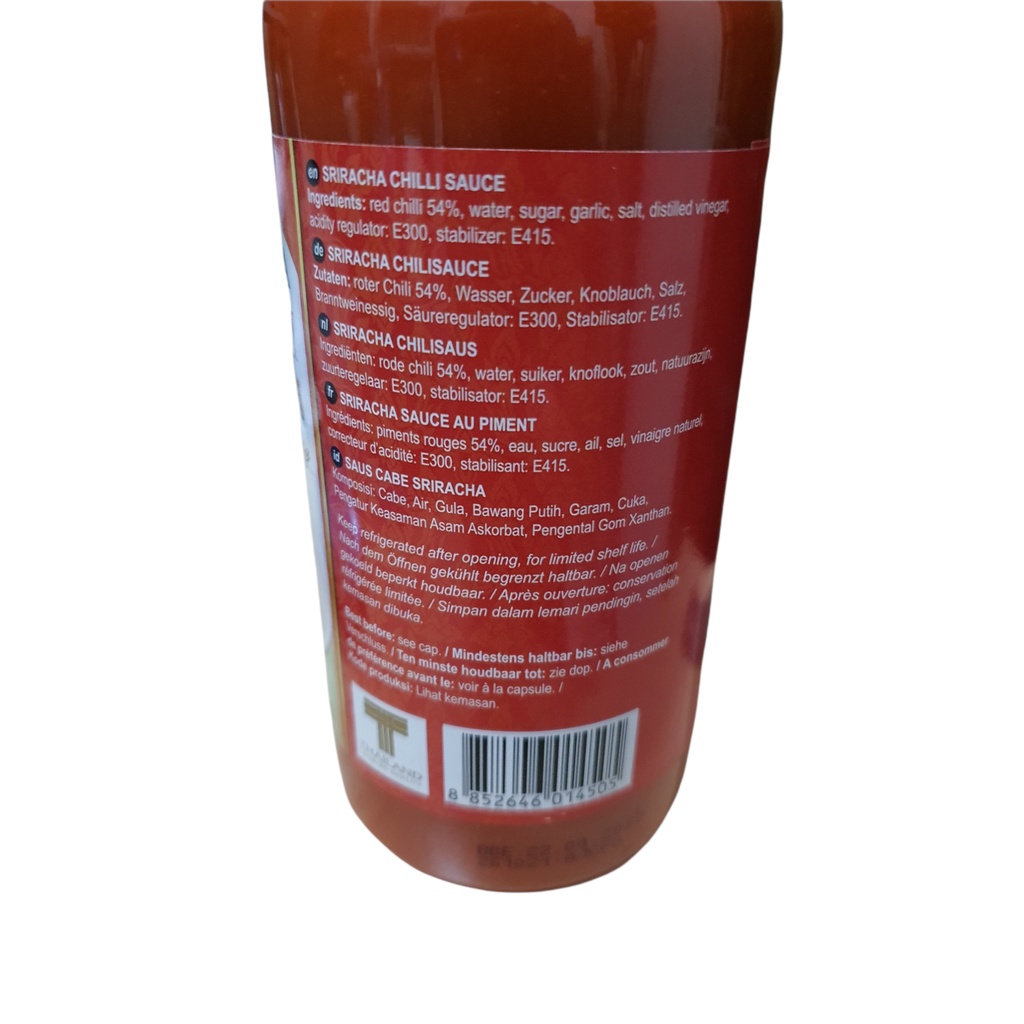 Sriracha Ingredients: What's In It? - PepperScale The back of the Sriracha label lists the following main ingredients: Chili Sugar Salt Garlic Distilled Vinegar Potassium Sorbate Sodium Bisulfite Xanthan Gum The "chili" in Sriracha is… A surprising hot pepper is behind the famous Rooster Sauce - red jalapeño. Surprised? Some may be. Many don't realize that jalapeños come in different colors. Huy Fong Foods Chili Sauce, Sriracha, Hot Nutrition Facts & Calories - Self NUTRITION INFORMATION Amounts per Custom Food (5g) Footnotes for Huy Fong Foods Chili Sauce, Sriracha, Hot Source: Nutrient data for this listing was provided by Custom. Each " ~ " indicates a...