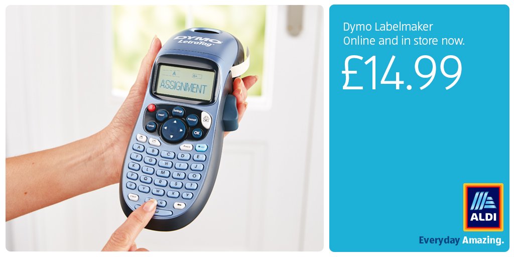 DYMO Labelmaker - ALDI UK The graphical display means you can review text before your print it, while the 9 label memory will safely store all your details so you can print anything you want without hassle. Features Large display Prints 5 font sizes, 7 text styles, 195 symbols and 8 box styles 9-Label memory Date stamping 195 Symbols Auto-off power saving
