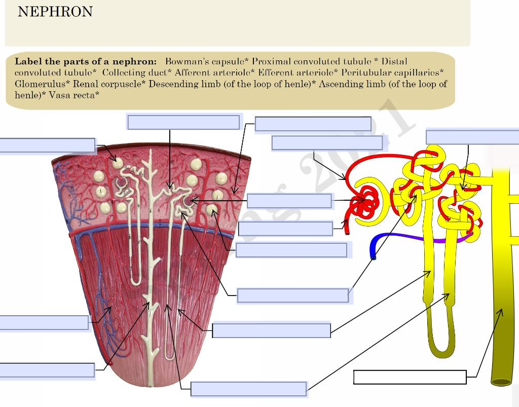 Nephron labeled diagram. Dog Organ Anatomy » AnatomyLearner >> The Place to Learn ... May 16, 2022 · Anatomical features of the dog heart with the labeled diagrams. In the dog heart labeled diagram, I tried to show you the following structures, but you should learn the details of these structures perfectly. Blood vessels of the dog’s heart (coronary artery, cardiac vein, and others), The intraventricular septum of the dog’s heart, Transport across Cell Membrane: 4 Ways | Biology ADVERTISEMENTS: Transport across cell membrane is classified into four ways: 1. Diffusion (Passive Transport) 2. Osmosis 3. Active Transport 4. Vesicular Transport. Cell membrane acts as a barrier to most, but not all molecules. Cell membranes are semi-permeable barrier separating the inner cellular environment from the outer cellular environment. Since the cell membrane is made […] Descending limb of loop of Henle - Wikipedia Within the nephron of the kidney, the descending limb of loop of Henle is the portion of the renal tubule constituting the first part of the loop of Henle Contents 1 Physiology histology - urinary system - preclinicalnotes Apr 22, 2014 · It contains the renal pyramids and columns, which are labeled. The renal columns are actually projections of the cortex into the medulla. As you can see, the renal pyramids (of which there are 8-12 in one human kidney) are a triangular/pyramidal shape and the columns lie between each one. Pyramids also contain the renal tubules.