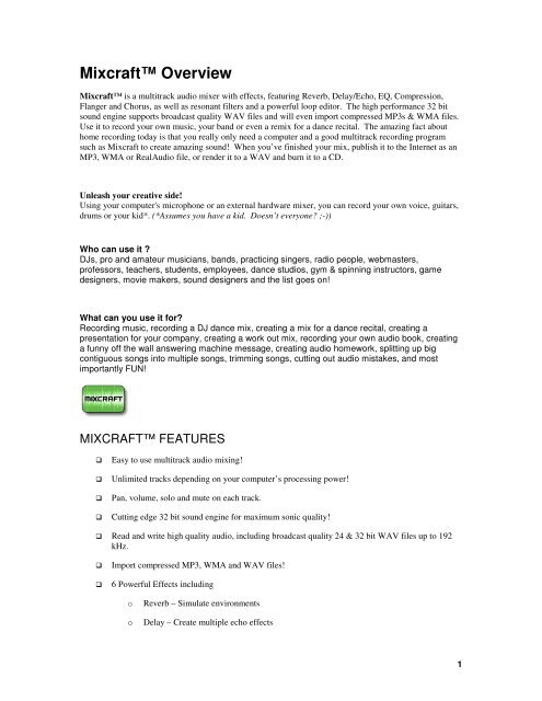 FREEWARE LINKS WebWaveSplit, Bchunker, CD/DVD COPY, AUDIO-CD, MP3Converter, MP3 Encoder, DROPCD, and CDR-TOOLS. Added on: 11-Jan-2004 ; DPS Freeware Transferer and Dead Pixel Checker. Added on: 22-Mar-2004 ; DPT Software Twenty-five old to very old Freeware programs. Dr Bill's Software Twenty-six unsorted programs. Added on: 09-Jan-2004 Mixcraft 9 Version History | Acoustica WebASIO Stop code now waits at most ~5 seconds (vs 25-30+ before) before giving up. track-height issues when duplicating tracks; Bug #9849, Optimized the MidiEnvelopeValues code. Fixed lost focus issue when clicking down on edit box. Keyboard control was not working. fix for min/max of tempo; Added feature for qwe without focus of sound tab Mixcraft 9 Recording Studio multitrack recording software. | Acoustica WebThe Industry's Best Workflow. Created by musicians, for musicians, Mixcraft is unrivaled in the industry for its ease-of-use and raw power. Record and mix your tracks to perfection, in record time, with Mixcraft's incredibly intuitive interface, lightning-fast sound engine, reality-defying pitch-shifting and time-stretching technology, and nearly-universal support for …
