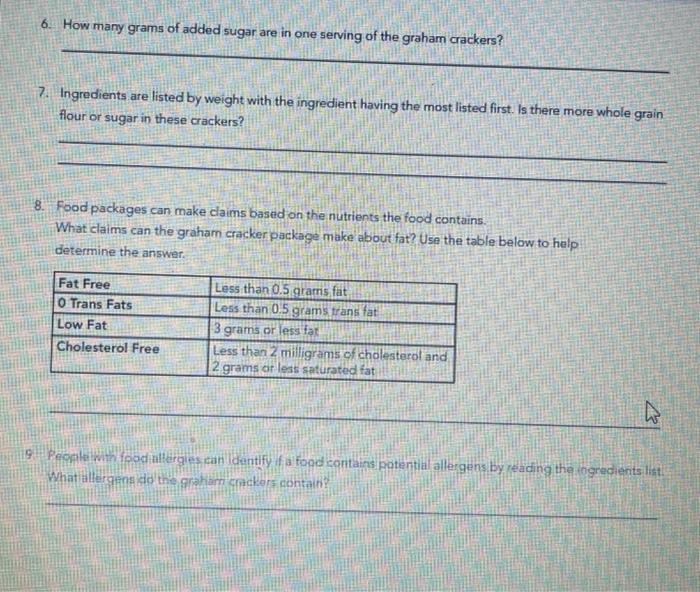 Nutrition Label Worksheet Answer Key Crackers Free The Best Nutrition Label Worksheet Answer Key Crackers Free 2023. This nutrition label contains information about the caloric content, amount of fat,. What nutrition facts labels tell you. Worksheets can be shared with others to collaborate on data analysis or to get feedback on the data. They can be shared in a variety of ways, including email ... Study 11 Terms | Nutrition Facts... Flashcards | Quizlet tells the minimum amount of carbohydrate, fiber, Vitamin A, Vitamin c, calcium, and iron we should eat every day. what does the maximum % daily value tell you about the food label? tells the maximum amount of fat, saturated fat, trans fat, cholesterol, and sodium allowed in one day. many labels base their percent of daily values on how many ... NutritionFactsLabelworksheet .pdf - 411102/471102 Get to Know Nutrition ... 411102/471102 Get to Know Nutrition Facts Labels Poster/Handout 1 • ©Learning ZoneXpress What Nutrition Facts Labels Tell You. WORKSHEET Answer the following questions by reading the Nutrition Facts label for cinnamon graham crackers shown. 1. How large is the serving size listed on the label? 2. How many calories are in one whole graham cracker?