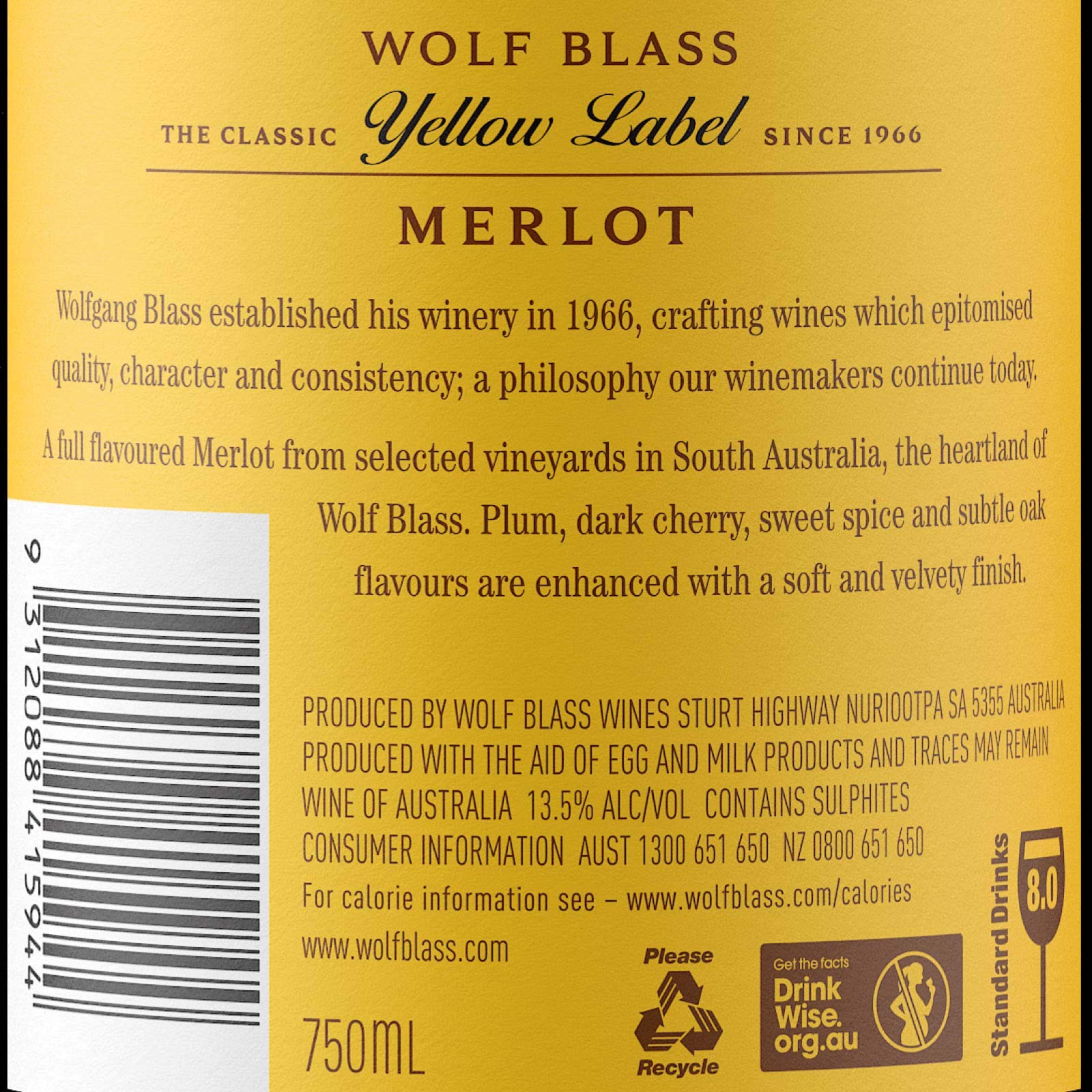 Wolf Blass Yellow Label Merlot 2021 | Wolf Blass Wolf Blass Yellow Label Merlot 2021 | Wolf Blass Country : United States of America Chasing excellence since 1966 Please enter your year of birth: Remember me You confirm you are aged 18 years or over, are of legal drinking age and that any purchases you make will be for personal use only.